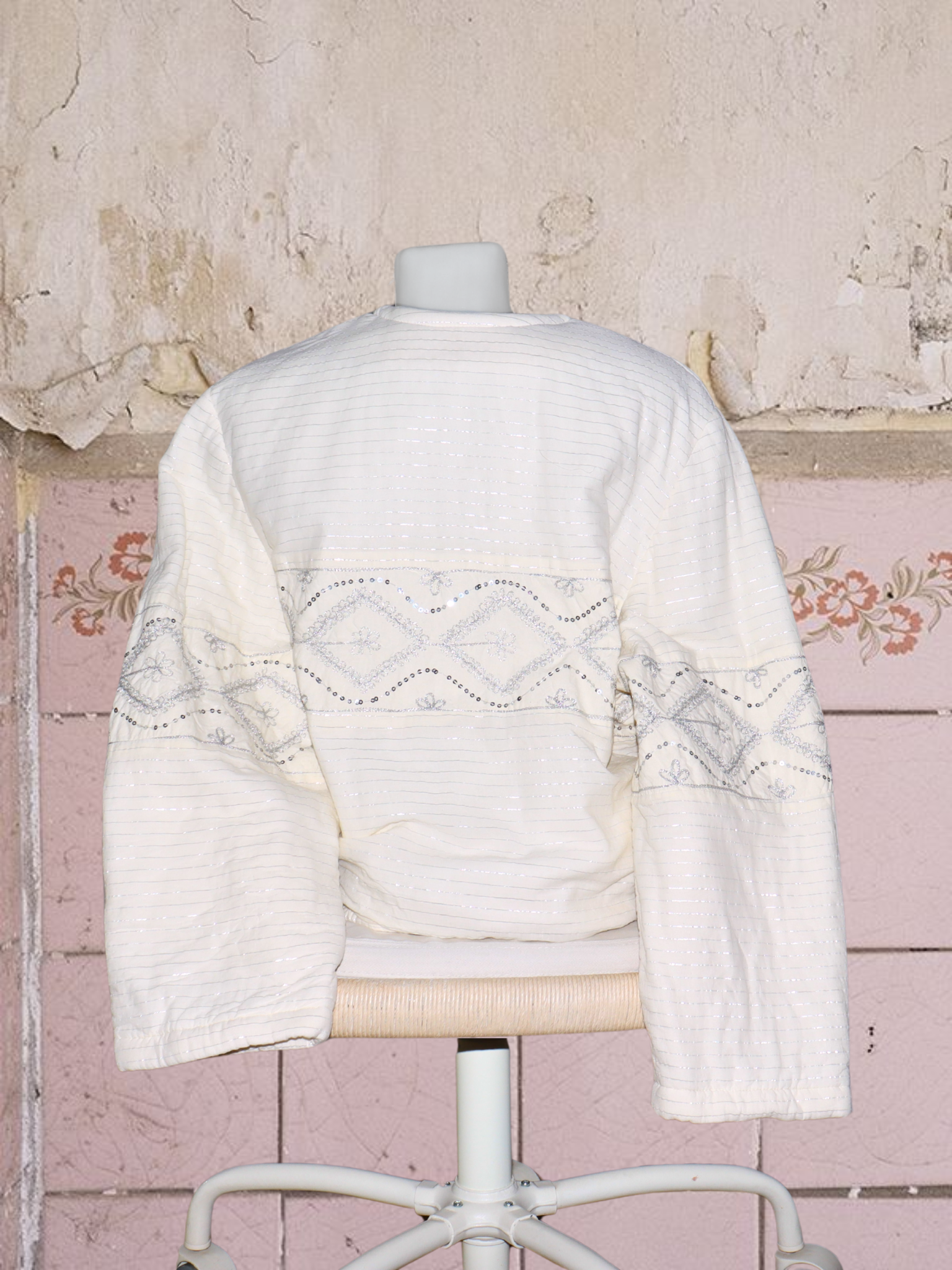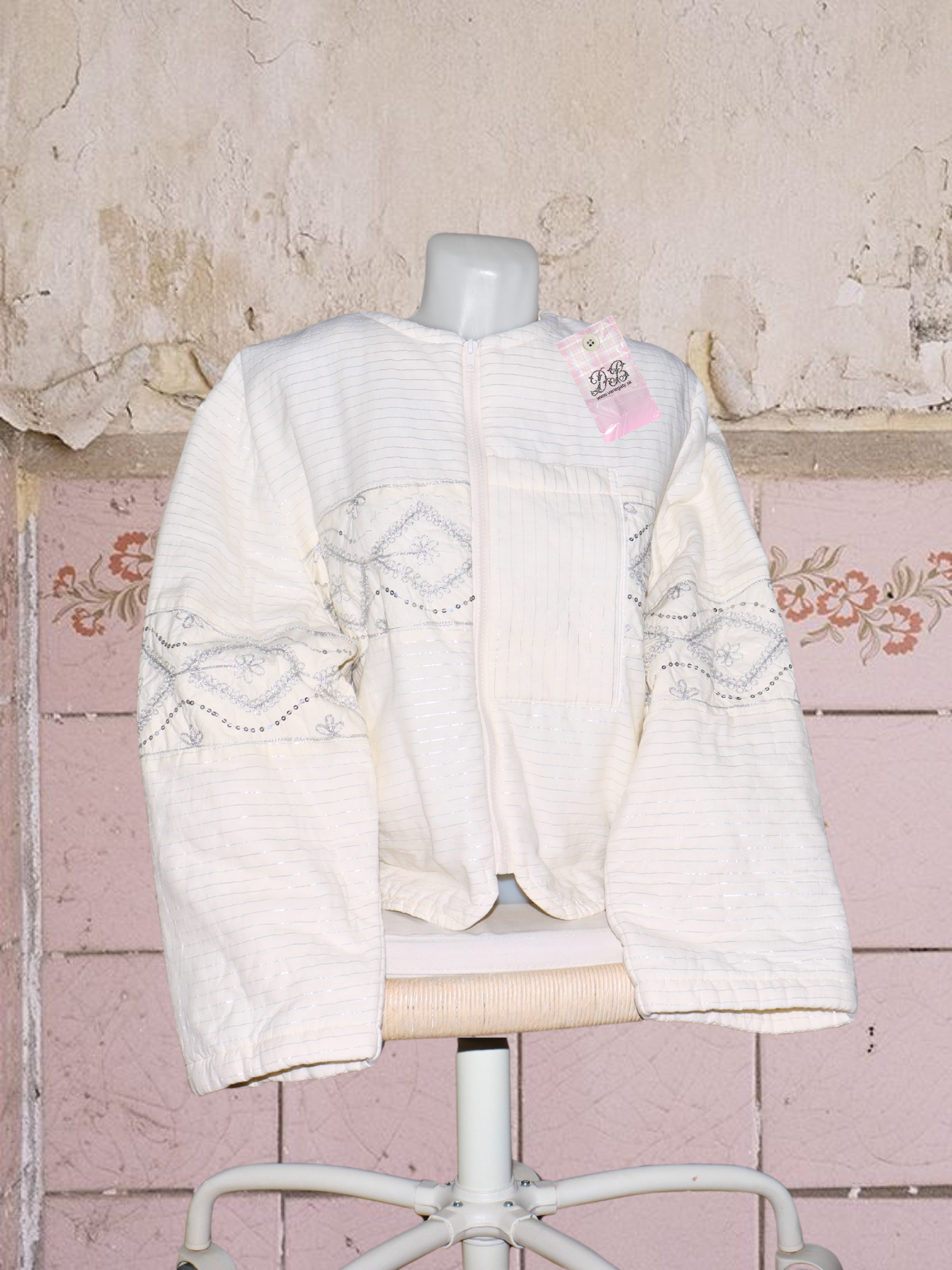 ● upcyklované bundy vytvorené z bytového textilu (prehoz s flitrami a strieborným prešívaním)